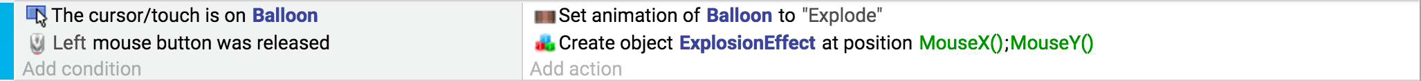 La condición llamada "El cursor / toque está en un objeto" verificará si el cursor del mouse o un toque de pantalla se realiza en un objeto (s) determinado (s).