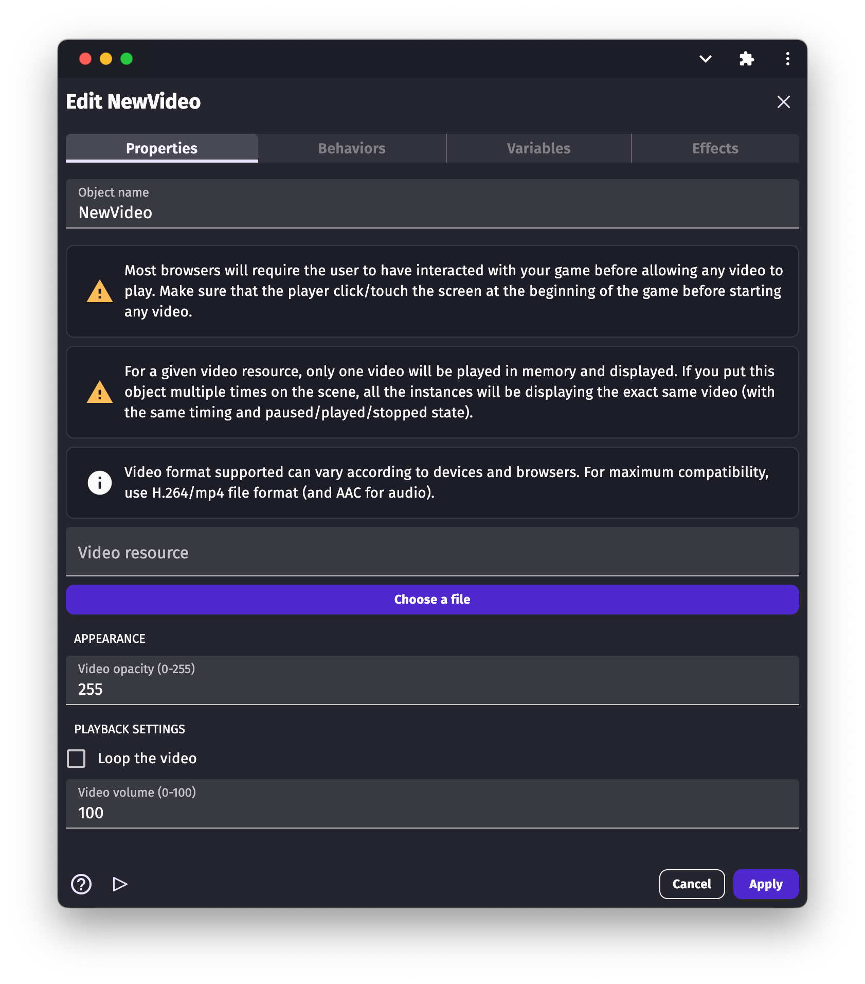 A video object displays a video on the screen. It's perfect for cut-scenes in a game. Videos can be controlled using events: timing, state (play/paused), audio volume, etc.