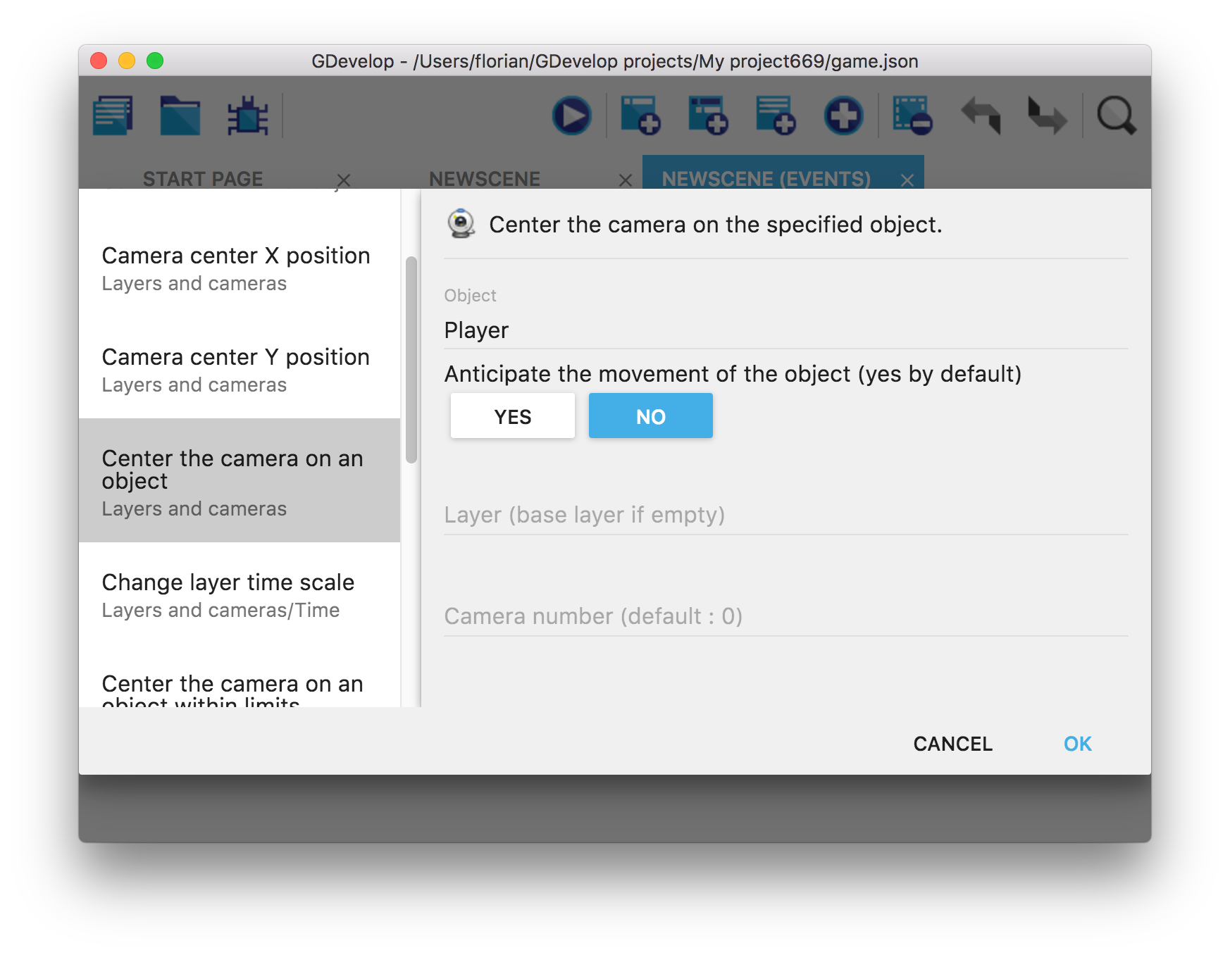 That was easy right? There are other actions that can be useful. For example, actions can be used to change the coordinates of the camera only on the X or Y axis. It can be useful for platform games where you can't go up/down but just go through the level with a side scrolling.