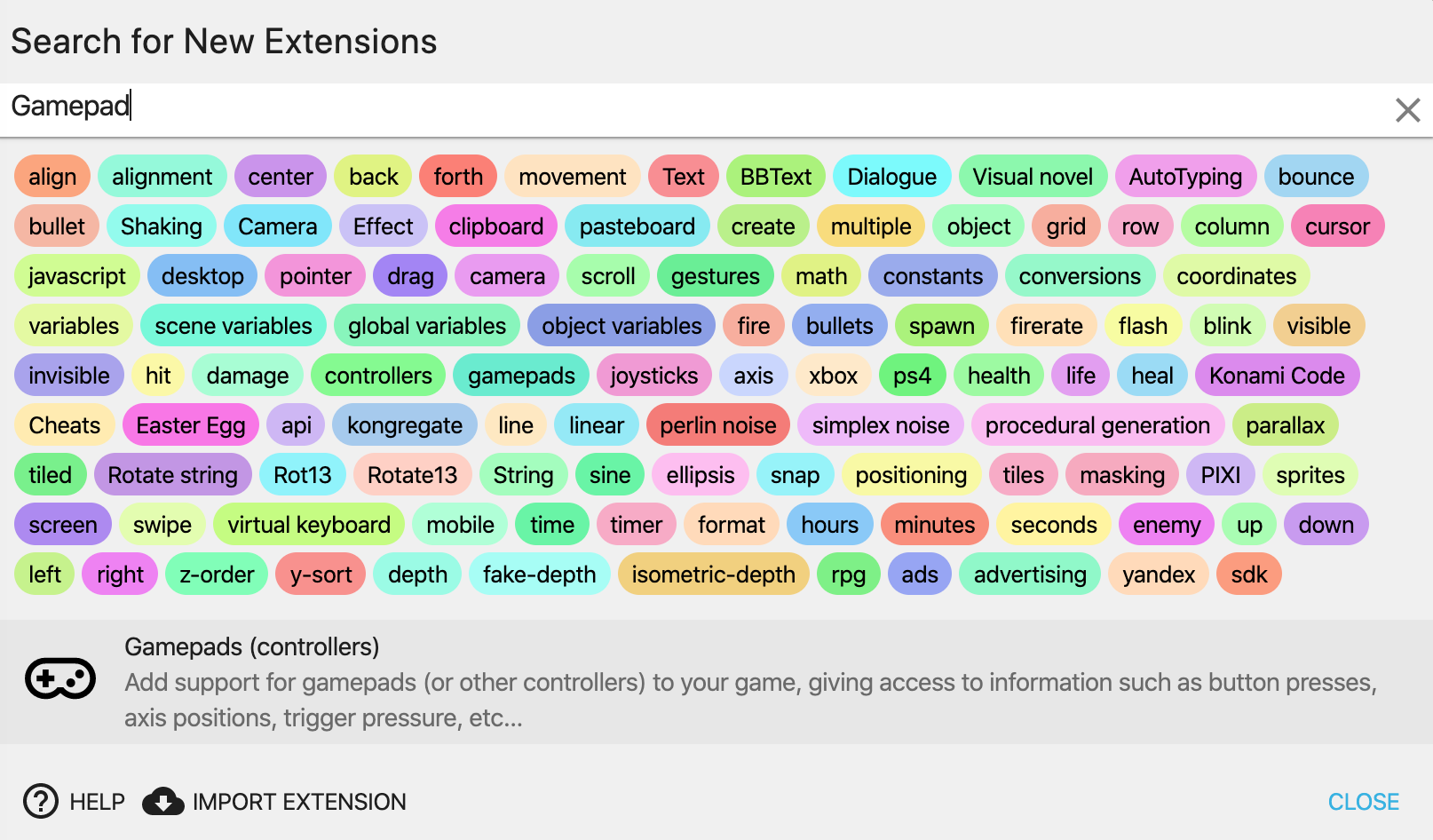 この機能はゲームパッド拡張機能をプロジェクトに追加すると有効になります。その後、条件か式の中でゲームパッドが接続されているかどうかやボタンを押したか、ボタンを放したか、スティックを押したかなどをテストできます。