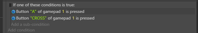 両方のコントローラーに(さらにそれ以外にも)対応するのは簡単です。または(OR)条件を使って、その内部にそれぞれのコントローラーに対応する個別条件を追加するだけです。