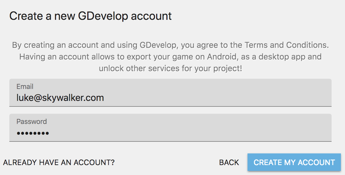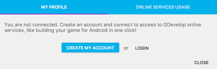 GDevelop 関連機能の中には GDevelop アカウントが必要になるものがいくつかあります。Android 、iOS、Windows、macOS、Linux 向けゲームのワンクリック エクスポートはその代表です。