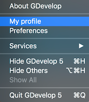 アカウントを持っていない場合は、無料で作成できます。[ファイル]メニュー(Windows および Linuxの場合)または GDevelop メニュー(macOS の場合)から[マイ プロファイル]を選択してください。