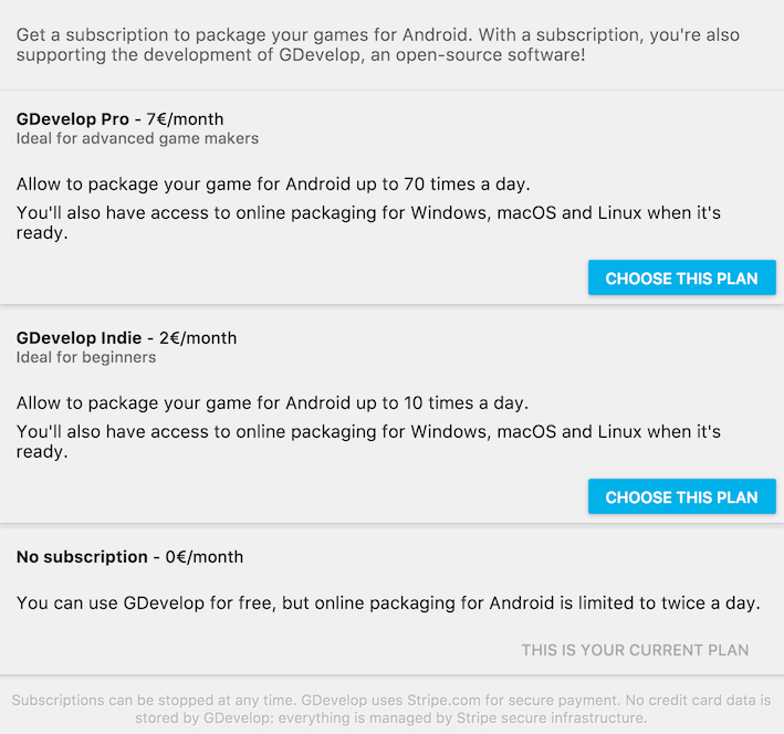 サブスクリプションを取得すると、この 1 日 2 パッケージ制限が解除されます。将来的には、他の OS へのワンクリックパッケージや便利なサービスも提供される予定です。これらのサービスの一部は現在ベータテスト中です。またサブスクリプションは、GDevelop の将来の開発も支えています✨
