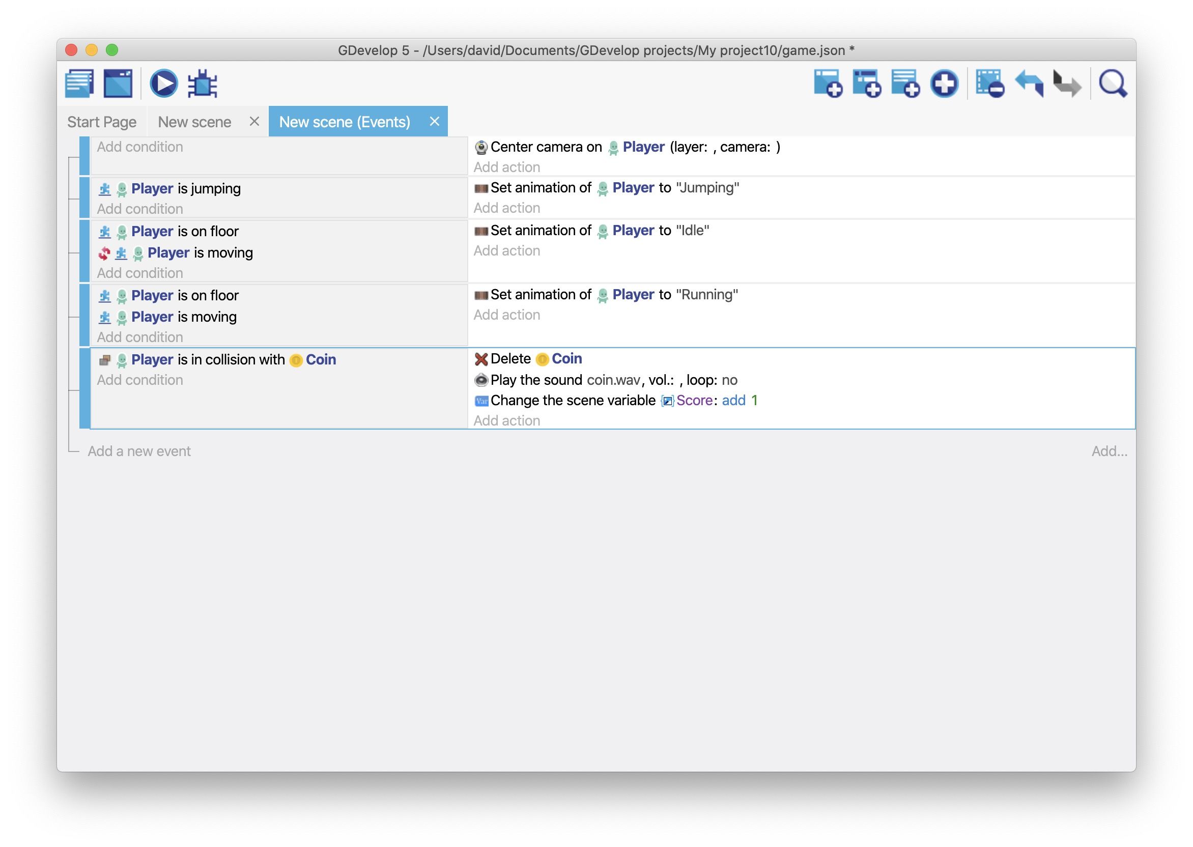 - 「Player」オブジェクトの衝突条件をイベントに追加して、「Coin」との接触をテストします。