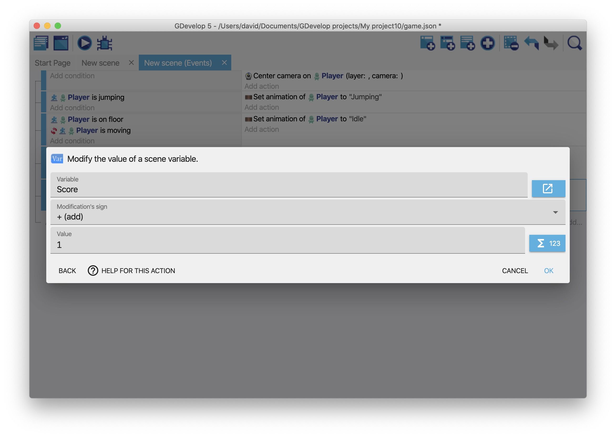 - シーン変数の値アクション(変数カテゴリーの下にあります)を、手前で作成したイベントに追加します。