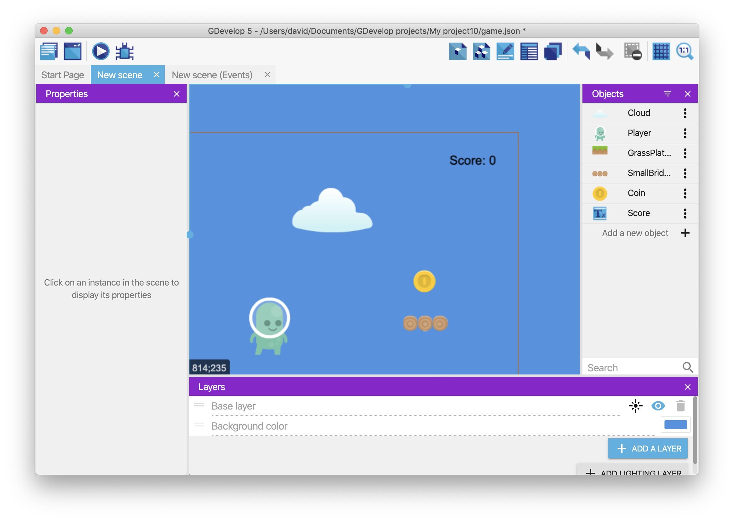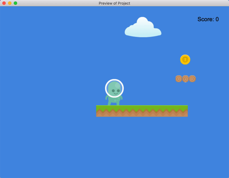 ゲームをプレビューして、プレイヤーがコインと接触するとコインが消えて効果音が鳴ることを確認しましょう。
