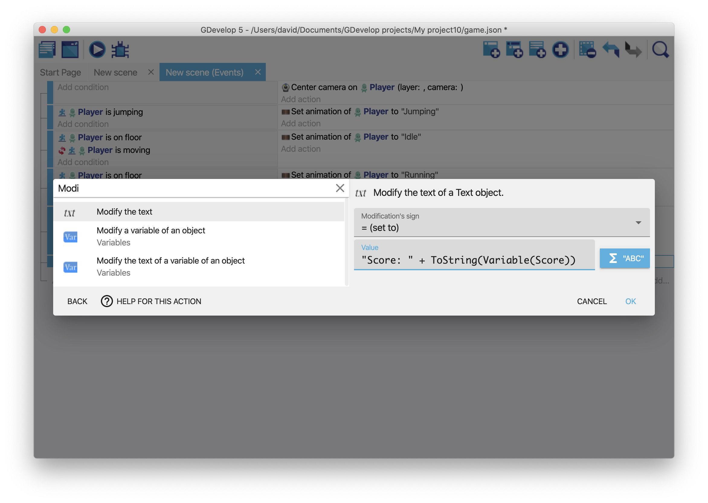 - 条件を指定せずに、「Score」オブジェクトに対するテキストを修正するアクションを追加します。条件を指定しないと、アクションは必ず毎フレーム実行されます。これによって、スコアを常に正確に表示できます。
